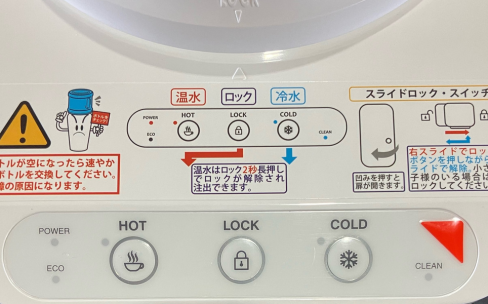 冷水注水ボタンを押し、水が出ることを確認します。 また温水ロックボタンを2秒長押しして温水ロックを解除(温水ランプ点灯→点滅)した後、温水注水ボタンを押し、水が出ることを確認して下さい。